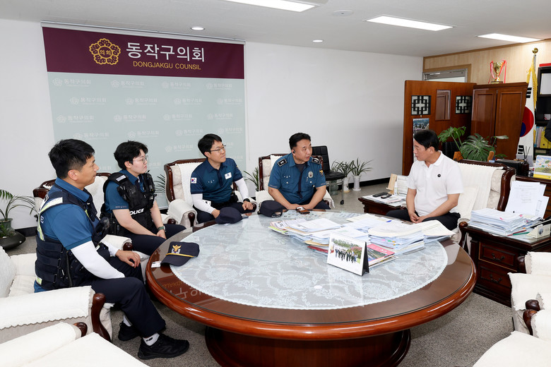 [동작구 세계타임즈=이장성 기자] 동작구의회 정재천 의장은 23일 의장실에서 서울경찰청 기동순찰대와 간담회를 갖고, 구민 안전을 위한 치안 협조 체계 강화 방안을 논의했다. 간담회에서는 재개발로 인한 공가 및 공사장 주변 순찰 강화, 범죄 취약지역 예방 순찰, 침수 우려 지역 시설개선 등에 대해 의견이 오갔다.