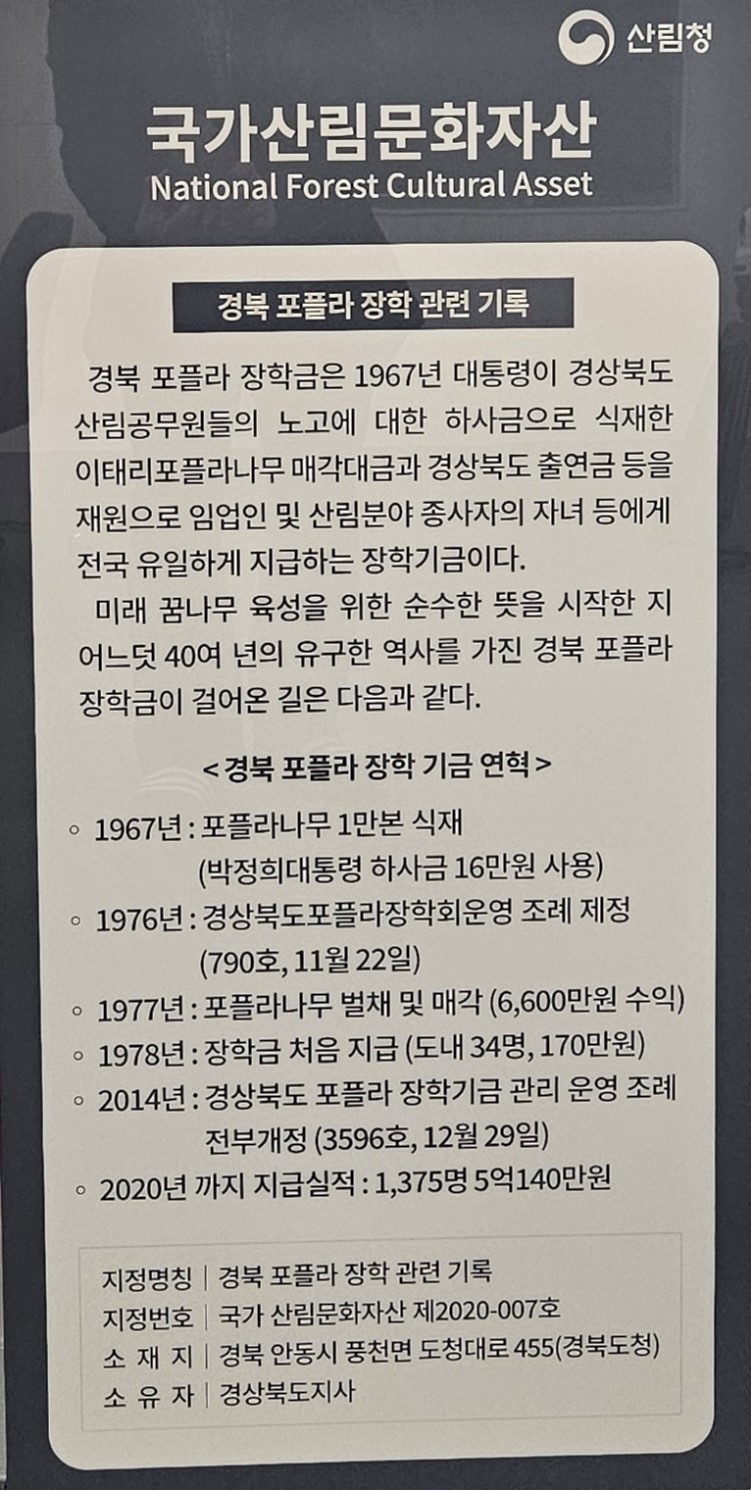 특히, 포플러 장학금은 1967년 박정희 대통령 하사금(16만원)으로 심은 이태리 포플러나무 매각 대금과 도 출연금 등을 재원으로 임업인과 산림분야 종사자 자녀 등에게 지급하는 장학금으로 국가산림문화자산으로도 등재돼 있으며 현재까지 1,465명의 학생에게 5억 9100만원의 장학금을 지급했다.