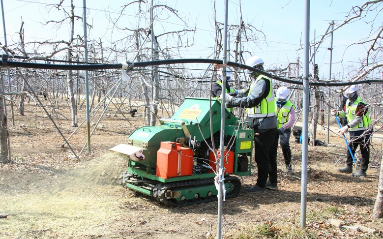 이어서 황금사과연구단지에서 영농부산물 파쇄 작업 연시회를 열고, 파쇄기 전시 및 설명, 목재파쇄기와 트랙터부착형 파쇄기를 활용해 영농부산물의 퇴비활용 과정을 선보였다.