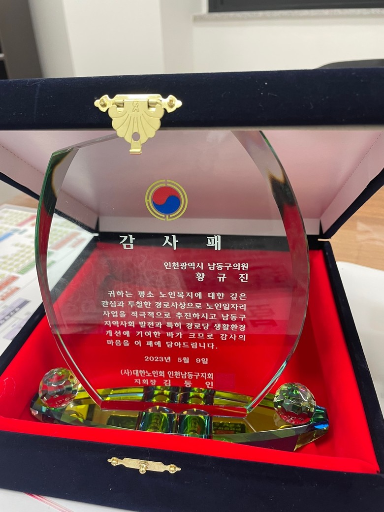 [남동구 세계타임즈=심하린 기자] 남동구의회 황규진 의원(더불어민주당·구월3,간석1·4)이 지난 9일 (사)대한노인회 인천남동구지회(회장 김동인)로부터 경로당 생활환경 개선 공로로 감사패를 수여받았다.
