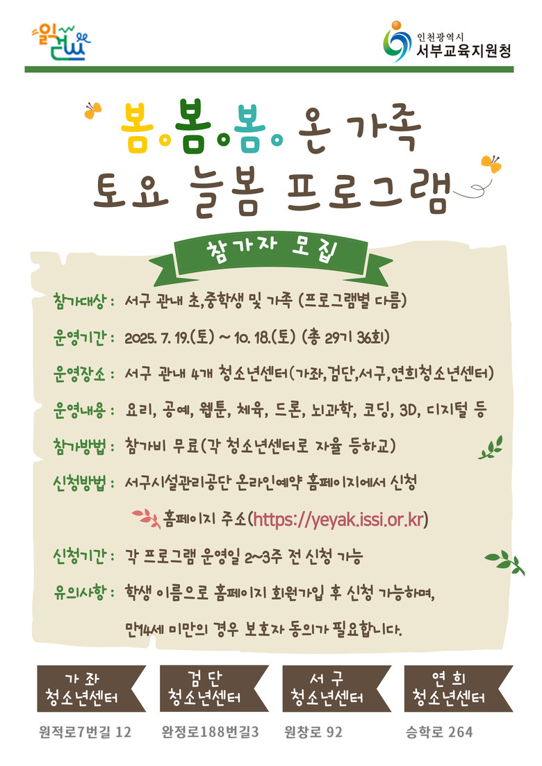 이번 프로그램은 인천서구시설관리공단과의 업무협약을 바탕으로 추진되며, 관내 가좌·서구·검단·연희 청소년센터 4곳에서 7월 19일부터 10월 18일까지 매주 토요일 총 36회에 걸쳐 진행된다.