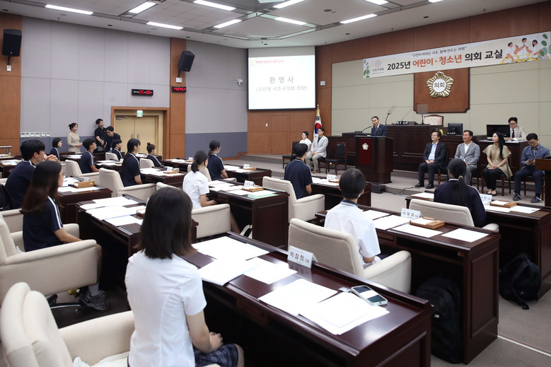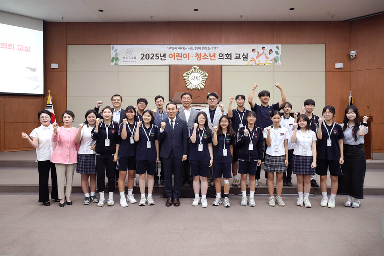 [서초구 세계타임즈=이장성 기자] 서초구의회(의장 고선재)는 8일, 3층 본회의장에서 서초중학교 학생 15명을 대상으로 ‘2025년도 어린이·청소년 의회교실’을 개최했다.