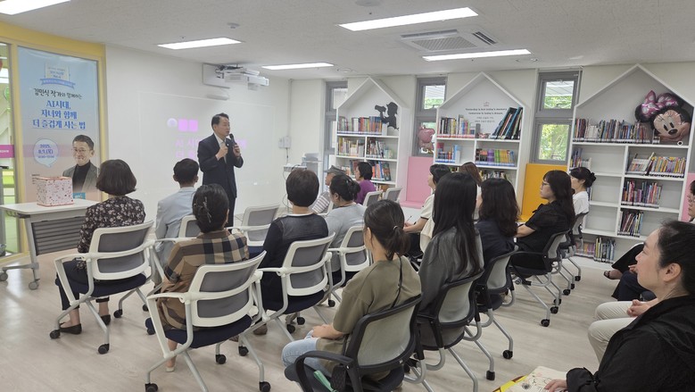 김 작가는 전 MBC 드라마 PD이자 ‘영어책 한 권 외워봤니?’, ‘매일 아침 써봤니?’의 저자다. 이번 강연은 ‘AI 시대, 자녀와 함께 더 즐겁게 사는 법’을 주제로, 미래 사회를 살아갈 아이들에게 필요한 핵심 역량과 그에 맞는 부모의 역할을 고민하는 뜻깊은 시간으로 마련되었으며, 자녀 교육에 관심이 많은 학부모 30여 명이 참여했다.