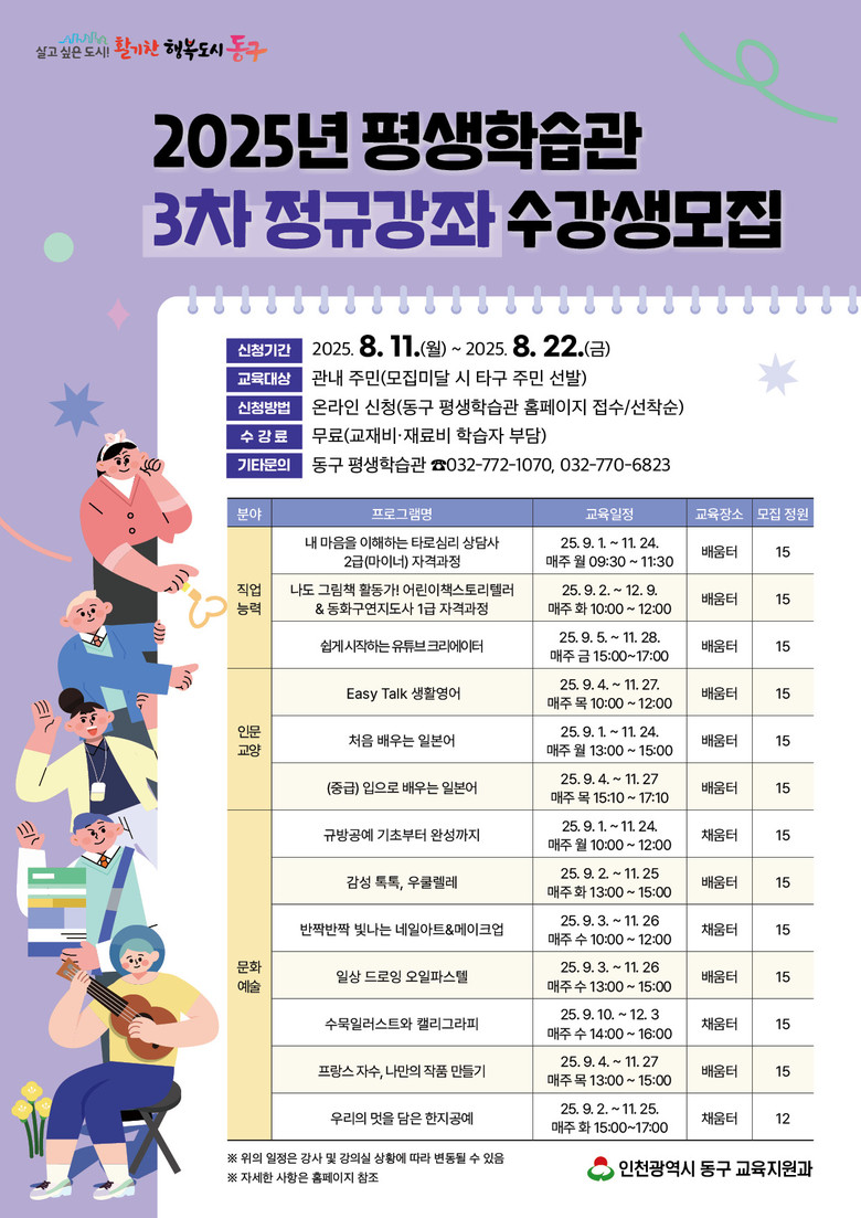 기타 자세한 사항은 동구 평생학습관 홈페이지 공지 사항을 참고하거나 평생학습관(032-772-1070)으로 문의하면 된다.