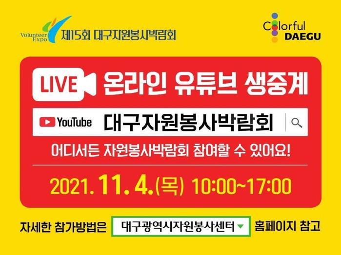 2006년을 시작으로 제15회째를 맞는 ‘대구자원봉사박람회’는 11월 4일(목) 10시 시청별관 대강당에서 코로나19 방역지침을 준수해 개막식을 개최하고, ‘대구자원봉사박람회’ 유튜브와 ‘같이봉사’ 어플을 통해 식전영상과 공연, 개막식, 자원봉사 프로그램(6개) 등이 실시간 생중계해 시민 누구나 참여 가능하다.