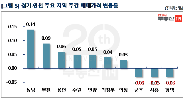경기ㆍ인천은 △성남(0.14%) △부천(0.09%) △용인(0.06%) △수원(0.05%) △안양(0.05%) △의정부(0.04%) 등이 올랐다. 성남은 주변 재개발 호재로 중앙동 중앙동힐스테이트1·2차가 500만원 올랐다. 부천은 상동 다정한마을쌍용, 동남이 1,000만원-1,200만원 올랐다. 용인은 입주연차가 짧은 구갈동 힐스테이트기흥, 기흥역지웰푸르지오, 역북동 골드클래스용인역북이 1,000만원-1,500만원 상승했다. 반면 입주물량이 많은 ▼평택(-0.03%) ▼시흥(-0.03%) 등은 하락했다. 평택은 이충동 LIG건영과 서정동 금호타운이 450만원-1,000만원 떨어졌고, 시흥은 신천동 경남아너스빌, 휴먼시아가 250만원-1,000만원 하향 조정됐다.