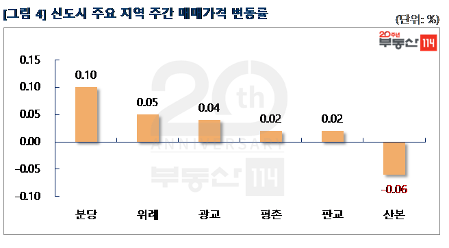신도시는 △분당(0.10%) △위례(0.05%) △광교(0.04%) △평촌(0.02%) △판교(0.02%)가 올랐고 ▼산본(-0.06%)은 하락했다. 분당은 정자동 정든동아, 분당동 장안건영, 서현동 시범삼성·한신 등이 500만원-2,000만원 올랐다. 위례는 창곡동 위례센트럴푸르지오가 250만원-500만원 상승했다. 광교는 실수요자들의 거래가 간간히 이어진 원천동 광교호반베르디움이 250만원-500만원 올랐다. 판교는 판교동 판교원마을7단지가 소형 위주로 거래된 후 500만원 올랐다. 반면 산본은 거래절벽으로 산본동 가야5단지주공1차가 500만원 떨어졌다.