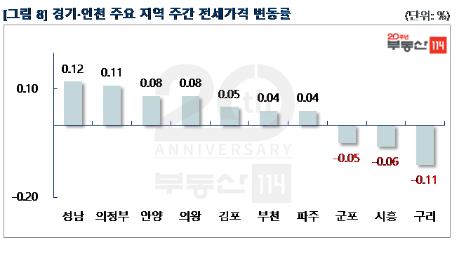 경기ㆍ인천은 △성남(0.12%) △의정부(0.11%) △안양(0.08%) △의왕(0.08%) △김포(0.05%) △부천(0.04%)등이 올랐다. 성남은 전세물건 부족으로 은행동 현대, 두산위브가 500만원 올랐다. 안양은 새 아파트 수요 증가로 호계동 평촌더샵아이파크가 500만원-1,000만원 상승했다. 의왕은 내손동 일대 대단지 아파트인 포일자이와 의왕내손e편한세상이 500만원 상승했다. 반면 ▼구리(-0.11%) ▼시흥(-0.06%) ▼군포(-0.05%) 등은 떨어졌다. 구리는 인근 다산신도시의 입주 여파로 인창동 구리더샵그린포레1단지와 갈매동 갈매역IPARK가 500만원 하향 조정됐다. 시흥은 올 상반기 배곧신도시에 입주에 이어 9월 장현동과 대야동에 1,300여 가구가 들어서면서 정왕동 계룡1차가 500만원-2,000만원 떨어졌다.