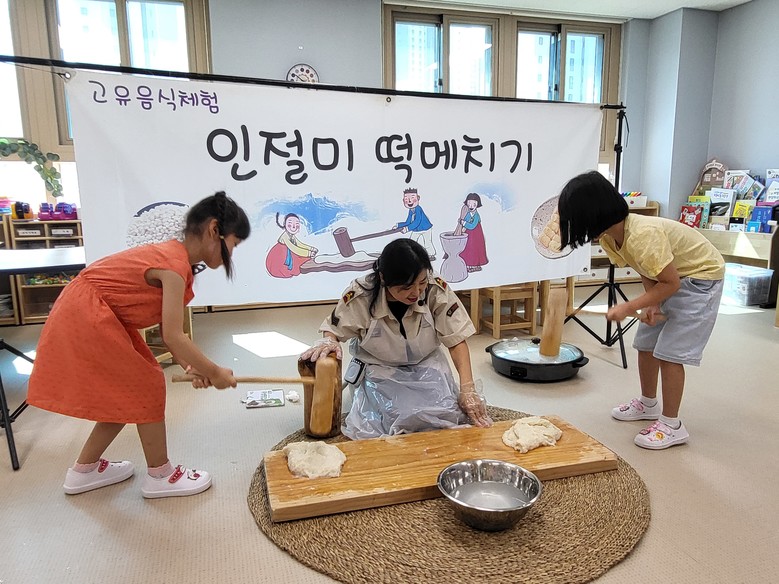 전통 놀이 체험은 ‘투호 놀이, 윷 던지기, 제기차기, 굴렁쇠 굴리기, 양궁 놀이’등이 진행되었다. 이와 더불어 우리나라의 전통 의복인 한복의 변천사와 ‘공수 자세’, ‘웃어른께 큰절 하는 법’을 배워보는 예절교육도 함께 진행되었다. 특히 이번 체험교육 중 우리 전통음식 ‘인절미 만들기’를 위한 떡 메치기 활동은 유아들의 가장 큰 흥미를 이끌었다. 더욱이 체험과정에서 유아들이 직접 만든 인절미가 가정으로 보내져 함께 나누어 먹음으로써 한가위의 풍성함을 더해주었다.
