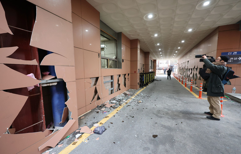 [세계타임즈 = 이장성 기자] 윤석열 대통령이 내란 우두머리 혐의로 구속되자 일부 윤 대통령 지지자들이 서울서부지방법원 내부로 난입해 불법폭력사태를 일으킨 19일 오후 서부지법 건물 외벽과 유리창 등이 파손돼 있다. 2025.1.19