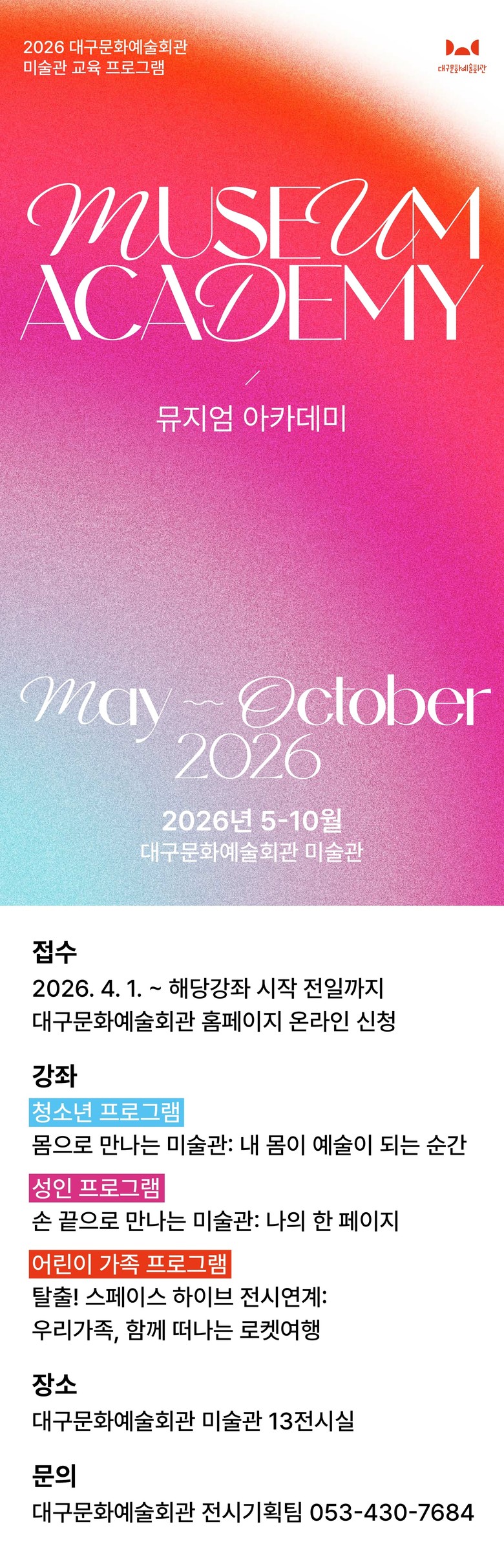 김희철 대구문화예술회관 관장은 “뮤지엄 아카데미는 작품을 감상하는 공간을 넘어, 직접 경험하고 참여하는 배움의 공간으로 확장하는 프로그램”이라며 “시민들이 일상 속에서 예술을 더욱 가까이 느끼는 계기가 되기를 기대한다”고 말했다.