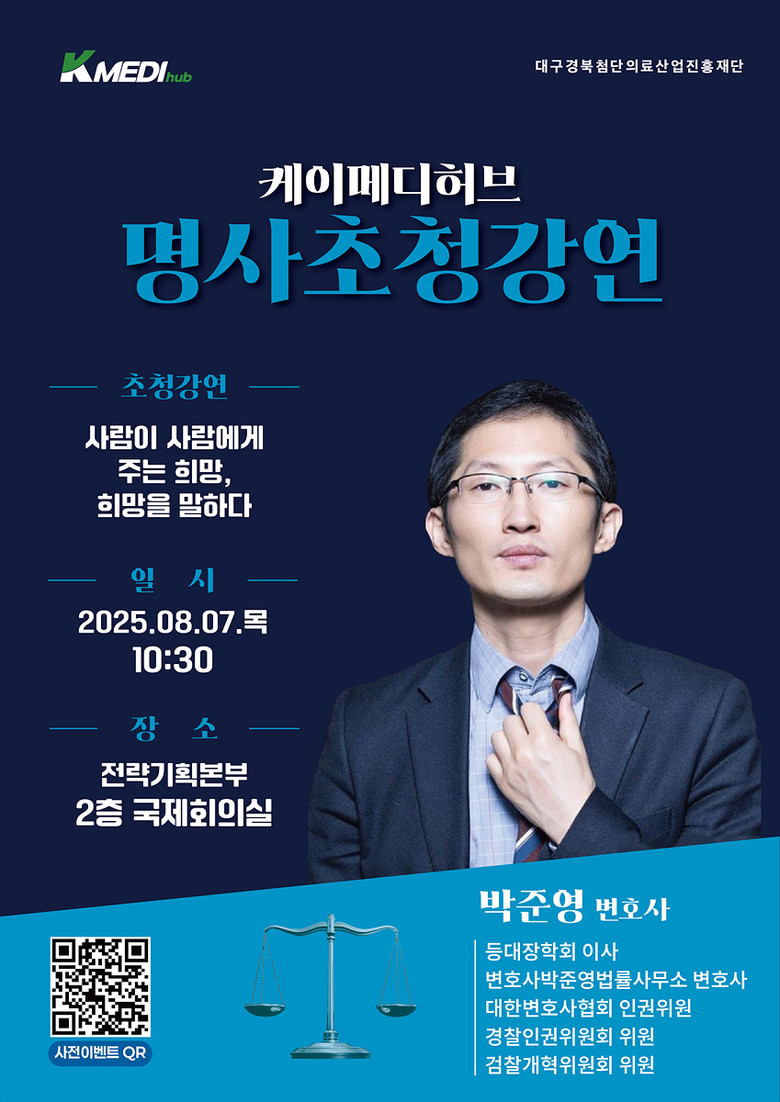 한편, 이번 강연은 재단 임직원뿐만 아니라 첨단의료복합단지 입주기업 관계자, 지역 주민들도 사전신청을 통해 참석 가능하며, 참여 신청은 홍보 포스터의 QR코드를 통해 가능하다.