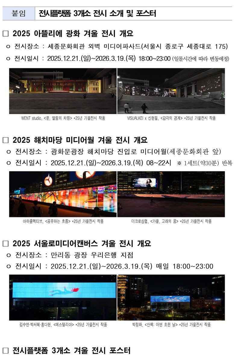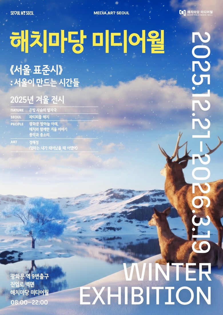 서울시는 21일(일)부터 내년 3월 19일(목)까지 매일 밤 ‘미디어아트 서울’ 전시플랫폼 3곳(▴아뜰리에 광화 ▴해치마당 미디어월 ▴서울로미디어캔버스)에서 겨울 전시를 무료로 선보인다.