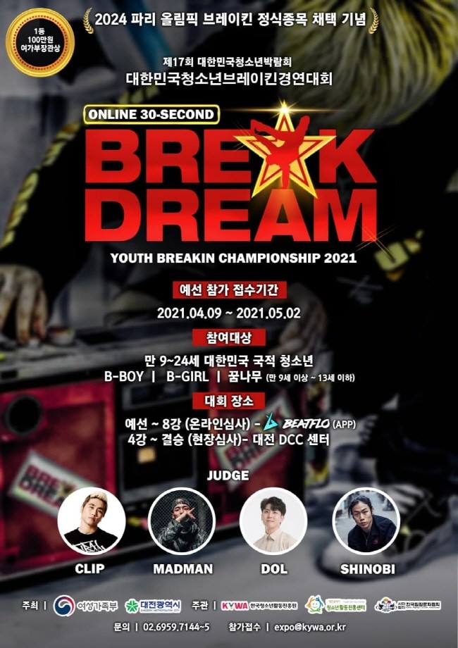 여성가족부는 제17회 대한민국 청소년 박람회의 특별 프로그램 ‘대한민국 청소년 브레이킨 경연대회’ 선수 선발 공모를 4월 9일부터 5월 2일까지 진행한다고 12일 밝혔다.