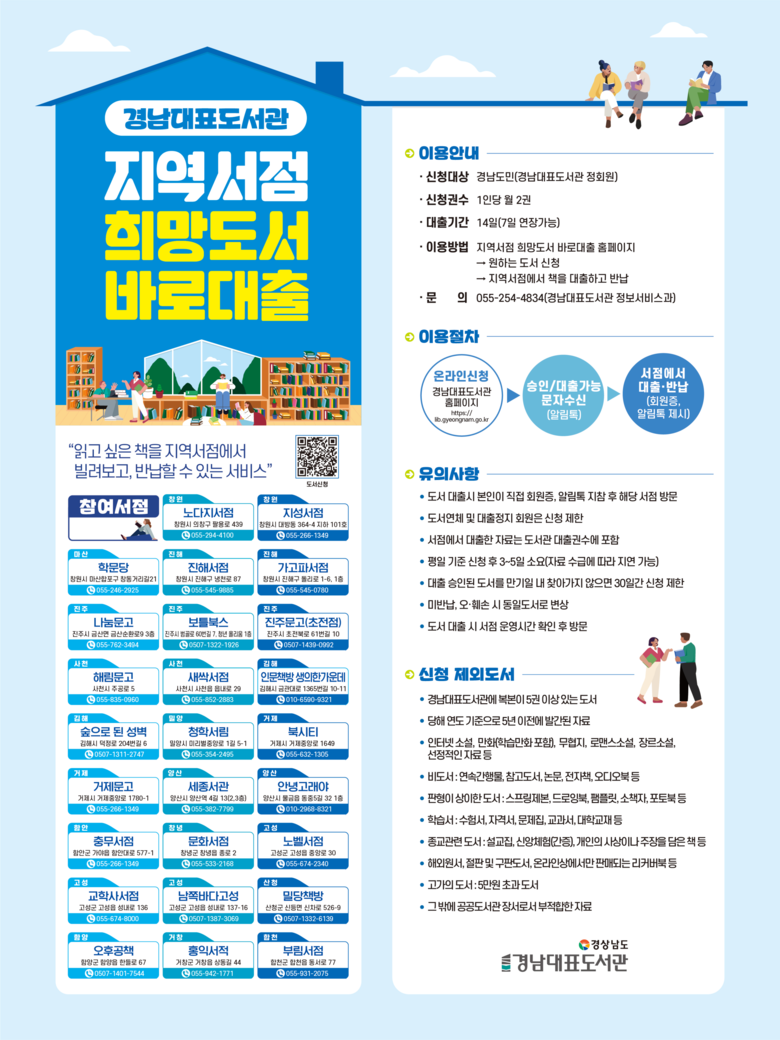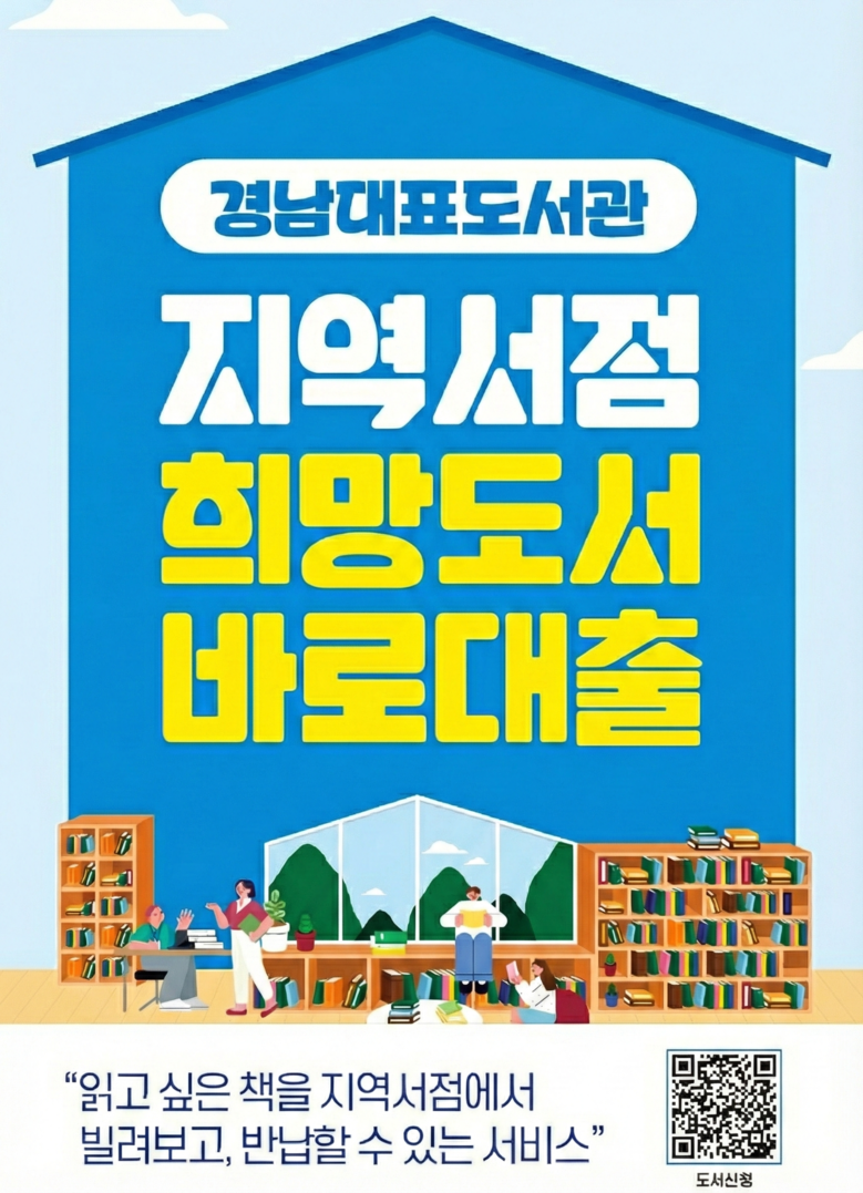 [세계타임즈=경남 최성룡 기자] 경남대표도서관(관장 강순익)은 오는 23일부터 도민의 도서 이용 편의를 높이고 지역 서점에 활력을 불어넣기 위해 ‘지역서점 희망도서 바로대출’서비스를 재개한다고 밝혔다.