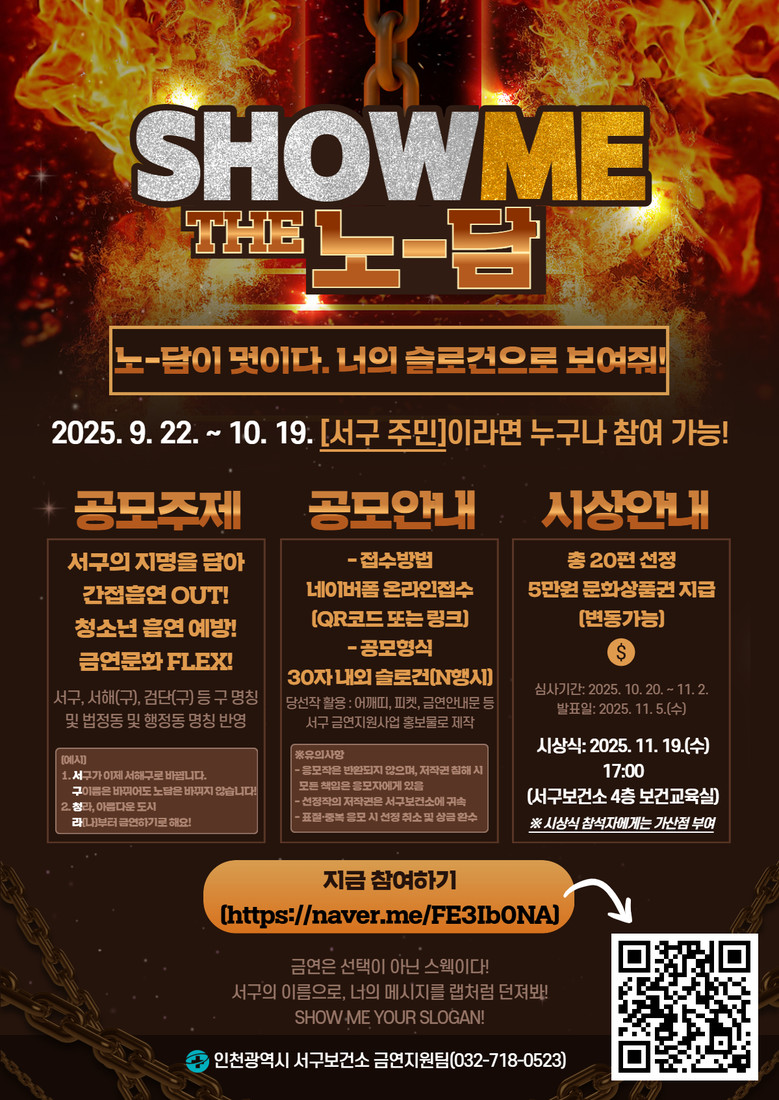 공공장소에서의 간접흡연 피해, 청소년 흡연 예방, 금연 문화 확산 등 금연 및 흡연 예방 환경 조성에 기여할 수 있는 내용을 담은 슬로건을 ‘서구’ 지명을 활용한 N행시 형식으로 제출하면 된다.
