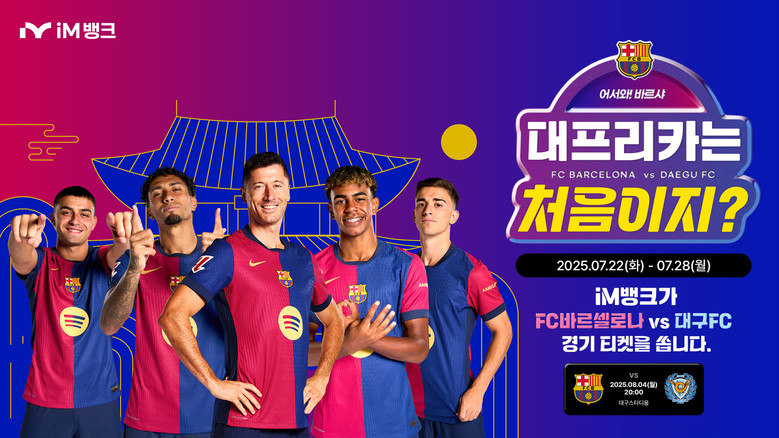 7월22일부터 28일까지 진행하는 ‘바르샤 어서와! 대프리카는 처음이지?’ 이벤트는 iM뱅크(아이엠뱅크) 앱을 이용하는 신규고객과 전체고객 대상으로 나뉘어 진행된다.