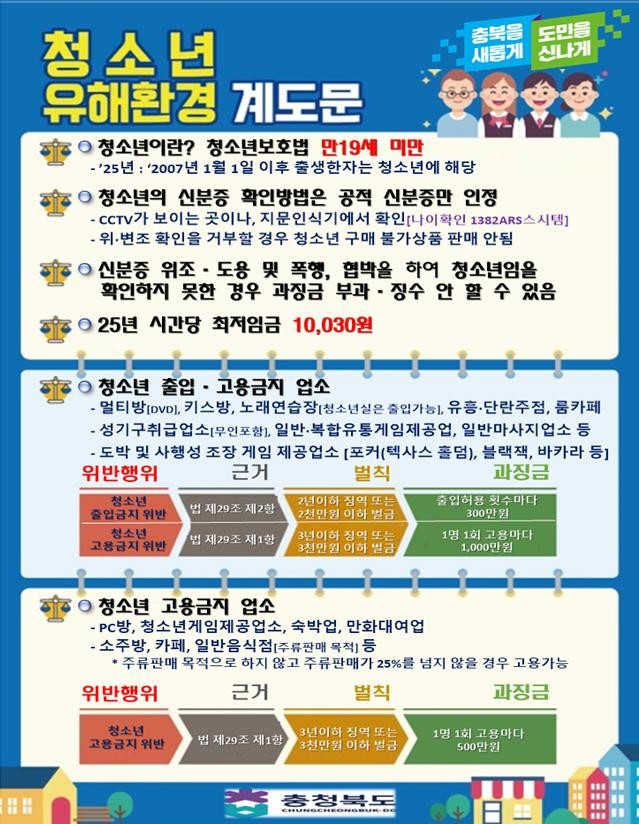 충북도 관계자는 “청소년이 안전하고 건강하게 성장할 수 있도록 유해환경으로부터 보호하고, 건전한 청소년 문화가 정착될 수 있도록 지속적인 단속과 계도 활동을 이어가겠다”며, “도민들의 적극적인 제보와 관련 업소의 자발적인 법 준수를 당부드린다.”고 밝혔다.