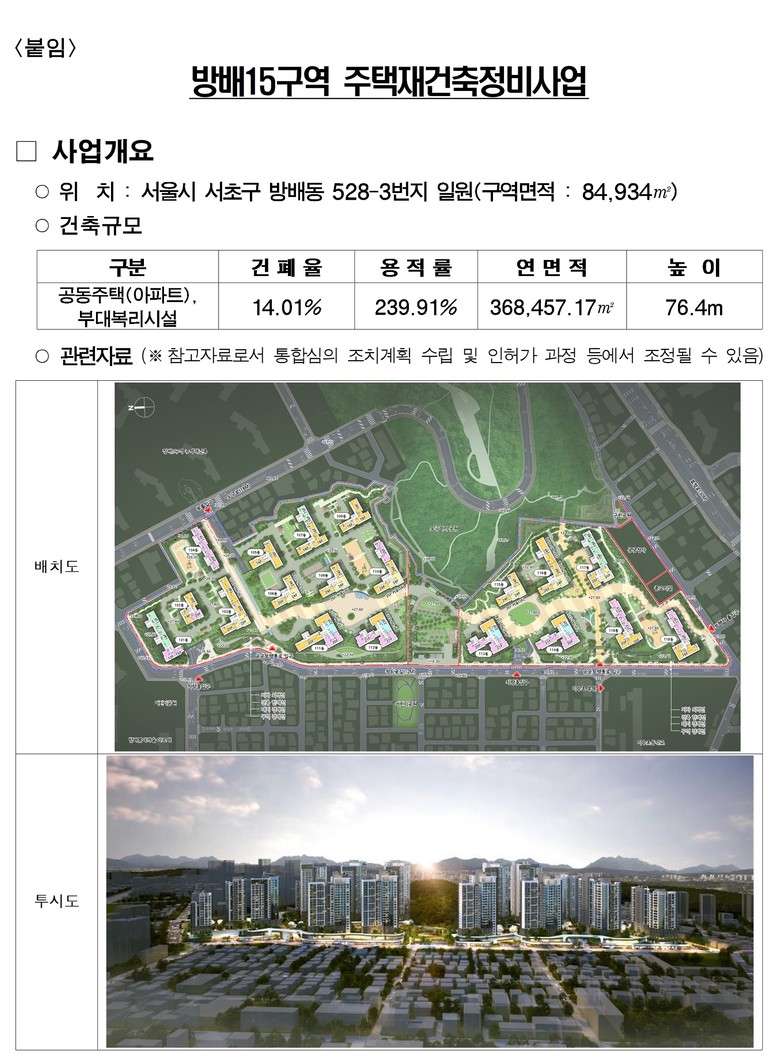 서울시는 9월 30일 제9차 정비사업 통합심의위원회에서 ‘방배15 주택재건축사업’을 위한 건축·경관·교통·교육·공원 분야를 통합심의해 ‘조건부 의결’했다고 밝혔다.