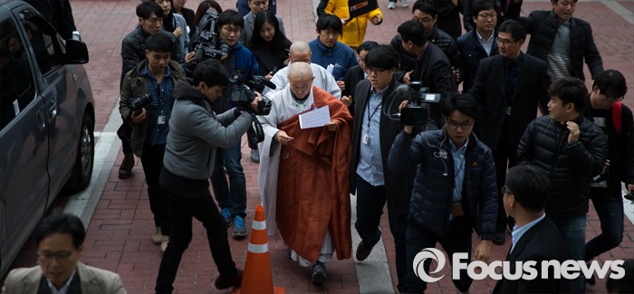 △ 지난 19일 오후 서울 종로구 조계사에서 조계종 화쟁위원회 위원장 도법 스님이 한상균 민주노총 위원장 신변보호 요청에 대한 화쟁위 회의 결과 발표를 끝낸 후 조계종 건물 안으로 발걸음을 옮기고 있다. <사진제공=포커스뉴스>