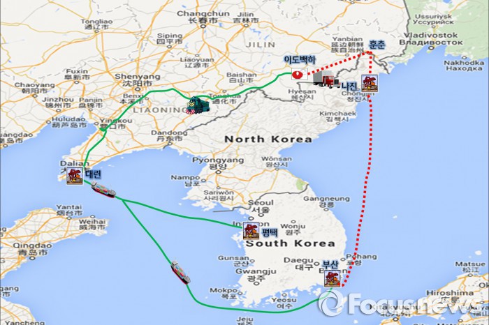 대련항까지는 육상으로 1000㎞, 다시 평택과 부산항가지는 해상으로 각각 600㎞, 1000㎞ 거리다.