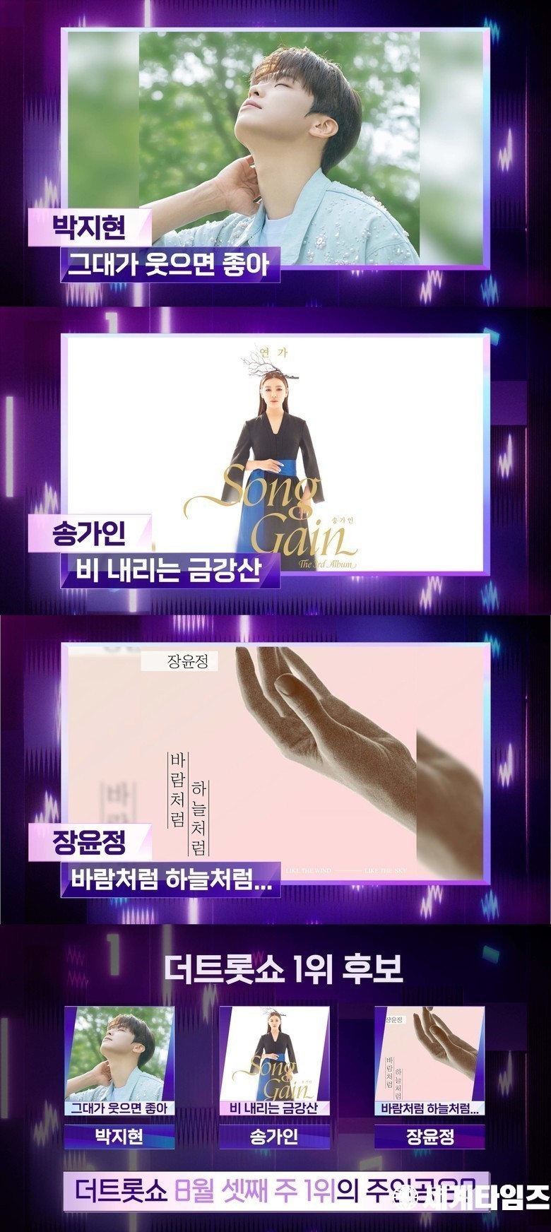 1위 후보곡은 맑고 청량한 음색으로 무더운 여름 힐링을 전달한 박지현의 ‘그대가 웃으면 좋아’와 호소력 짙은 보이스로 위로를 전하는 송가인의 ‘비 내리는 금강산’, 애절한 보이스로 많은 이들의 마음을 사로잡은 장윤정의 ‘바람처럼 하늘처럼…’이 선정됐다.