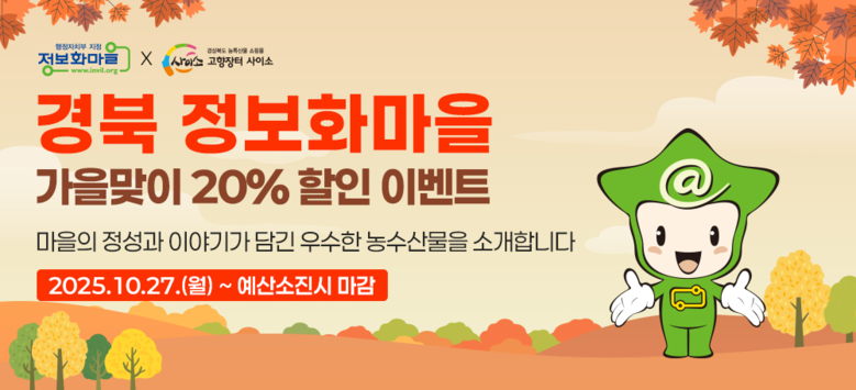 이번 할인 행사는 본격적인 수확철인 가을을 맞아 사과, 포도, 감, 대추, 잡곡, 꿀, 마늘, 홍게, 오징어 등 도내 정보화마을의 우수한 농수산물을 시중가보다 20% 할인된 가격에 판매한다.