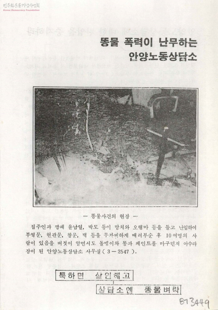 냄새도 심했고, 출입문과 창문, 문짝과 유리창 및 비품 등이 파손되어 청소와 원상회복 및 손해배상 등을 요구하면서 사무실 앞 도로에 천막을 치고 앉아 2∼3일 농성했어요. 또, 유인물도 만들어 뿌리고 집회계획도 세우는 등 항의했더니 “현저히 사회적 불안을 야기할 우려가 있는 집회를 주최한 죄 또 그러한 집회 예비음모죄 등을 뒤집어 씌어 구속시켰어요. 10개월 넘게 복역했어요.