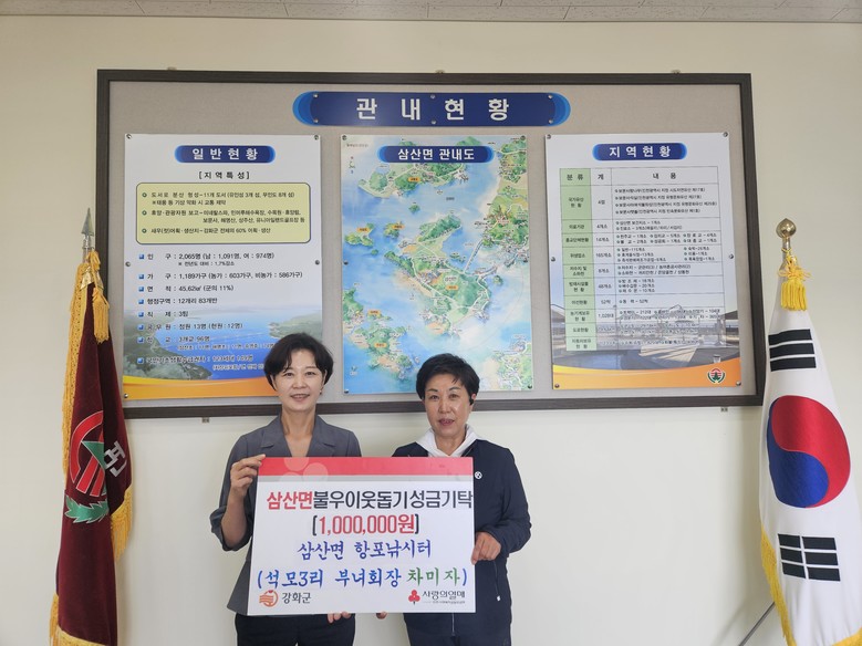 [강화군 세계타임즈=심하린 기자] 강화군 삼산면(면장 고영자)은 지난 18일, 항포낚시터를 운영 중인 석모3리 부녀회장(차미자)이 관내 어려운 이웃을 위한 성금 100만 원을 기탁했다고 전했다.