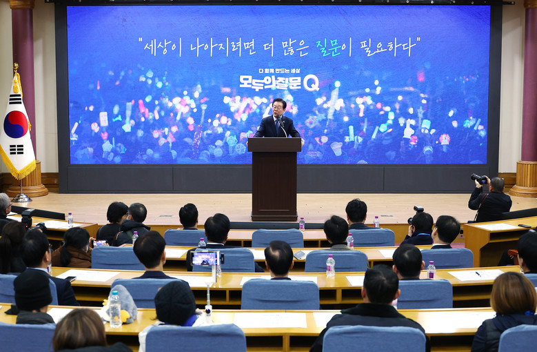 더불어민주당 이재명 대표가 7일 국회 의원회관에서 열린 정책소통플랫폼 '모두의질문Q' 출범식에서 격려사를 하고 있다. 2025.2.7