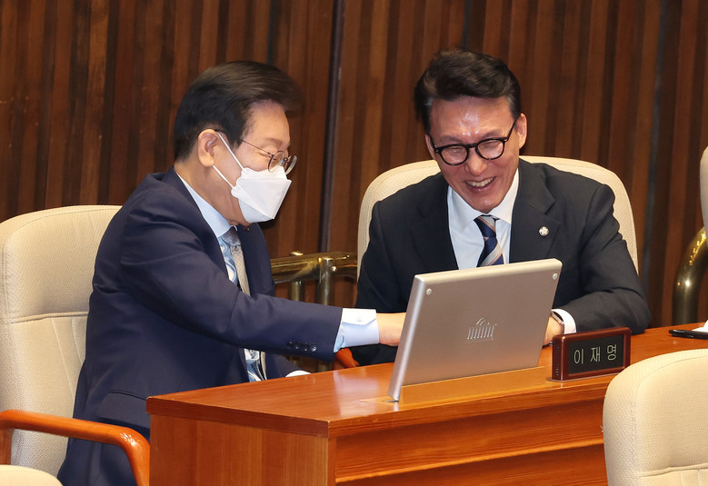 더불어민주당 이재명 대표(왼쪽)와 김민석 최고위원이 4일 오전 국회 본회의장에서 열린 2025년도 예산안 및 기금운용계획안에 대한 시정연설에 참석해 대화하고 있다. 2024.11.4