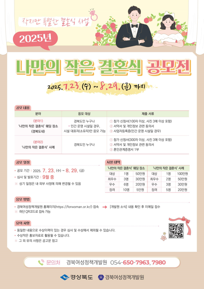 한편, 경북도는 민간 예식장이 아닌 다양한 장소에서 양가 합산 100명 이하의 결혼식에 최대 300만원의 결혼식 비용을 지원하는 ‘작지만 특별한 결혼식’사업을 시행하고 있다. 자세한 사항은 경북여성정책개발원 홈페이지 또는 전화 문의하면 된다.