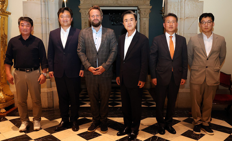 | ▲ (왼쪽부터)손일수 지앤티대표_이윤수 프레틀그룹 아시아대표_빌리 프레틀 그룹대표_김태흠 충남도지사_도 관계 공무원 등이 기념촬영을 하고 있는 모습. |