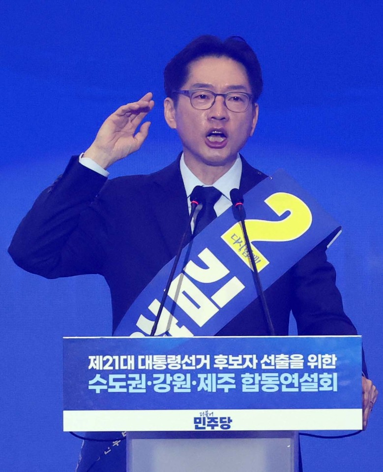[고양 세계타임즈 = 심귀영 기자] 더불어민주당 김경수 대선 경선 후보가 27일 경기 고양시 킨텍스에서 열린 '제21대 대통령선거 후보자 선출을 위한 수도권·강원·제주 경선 및 최종 후보자 선출 대회'에서 정견 발표를 하고 있다. 2025.4.27 [공동취재]