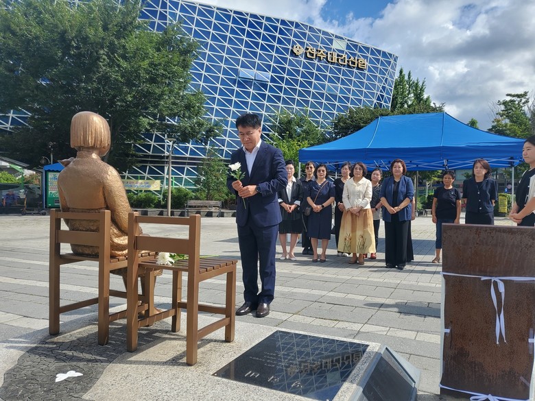 - 시민사회단체, 여성단체, 시민들과 함께하며 평화와 추모의 뜻 나눠 [세계타임즈=전주시 신승민 기자] 전주시는 ‘제80회 광복절’을 앞둔 14일 풍남문광장 평화의 소녀상에서 위안부 피해자의 아픔을 위로하며 추모하는 헌화 행사를 열었다.