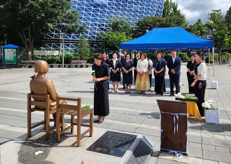 참석자들은 평화의 소녀상 앞에서 일제강점기 큰 고초를 겪은 일본군 위안부 피해자들의 아픔을 공감하고, 위로하기 위해 국화꽃을 헌화하고 묵념하는 시간을 가졌다.
