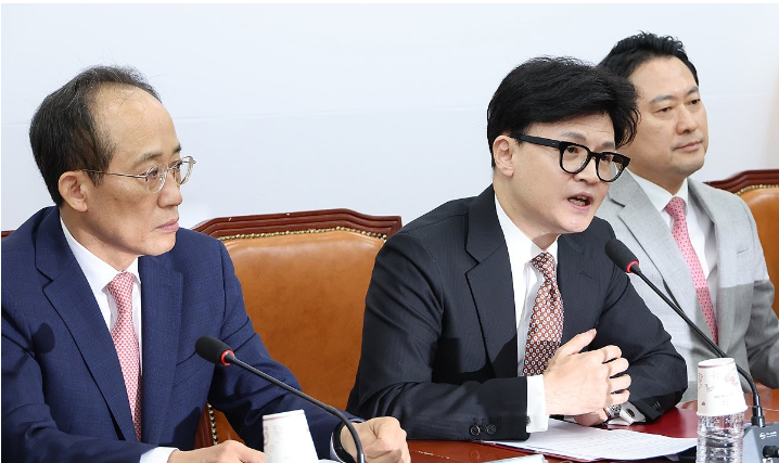 대통령과 영부인이 정치 브로커와 소통한 녹음과 문자가 공개된 것은 그 자체로 국민께 대단히 죄송스러운 일이라며 국민들의 큰 실망은 정부·여당의 큰 위기라고 밝혔다.이런 위기를 극복하려면 솔직하고 과감해져야 한다며 우리 당은 김영선 전 의원 공천을 단칼에 잘라낸 정당이다. 정치 브로커 관련 사안에 대한 엄정하고 신속한 수사를 당 차원에서 당당하고 강력하게 촉구한다고 말했다.한 대표는 이번 사안의 경우에, 적어도 지금은 국민들께 법리를 먼저 앞세울 때는 아니다라며 국민이 듣고 싶어 하는 말은 전혀 다를 것이라고 강조했다.더불어민주당 등 야권이 대통령 탄핵, 임기 단축 개헌까지 거론하며 총공세에 나선 것을 두고 어떤 이름을 붙인 헌정 중단이든 국민과 함께 국민의힘이 막겠다며 우리가 사랑하는 이 나라를 망치게 그냥 놔두지 않겠다고 강조했다.가만히 있으면 막을 수 없다. 그 뻔히 속 보이는 음모와 선동을 막기 위해선 변화와 쇄신이 반드시 필요하다고 말했다.한 대표는 회의 뒤 기자들과 만나 사과 정도로는 국민감정을 되돌릴 수 없다는 지적이 나온다는 질문에 중요한 건 이 상황을 푸는 것이라며 하나하나 필요한 조치를 해야 한다고 답했다.한 대표는 각종 쇄신 요구를 대통령실에 전달했는지를 두고선 그런 취지는 여러 차례 전달했다며 대통령실도 여러 고민을 하고 있고, 여러 상황을 인식하고 충분한 대처를 준비하고 있다고 믿는다고 밝혔다 자신이 요구한 조치들의 데드라인에 대해선 구체적인 시기를 언급하지 않으면서도 민심에 부합하는 조치가 필요하다. 저는 시급한 상황이라고 인식한다고 말했다.한 대표는 윤 대통령이 2025년도 정부 예산안 설명을 위한 국회 시정연설에 불참한 데 대해 아쉽다고 평가했다.