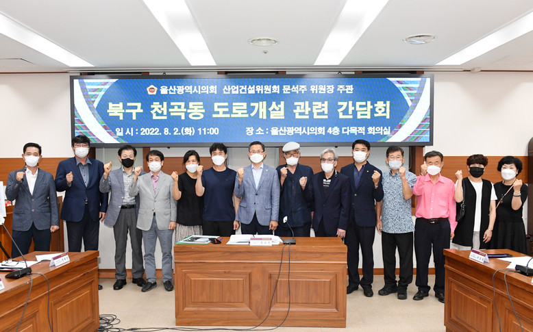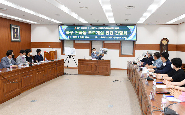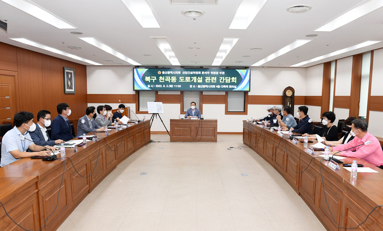 [울산 세계타임즈=이호근 기자] 울산광역시의회 문석주 산업건설위원장은 8월 2일 오전 11시, 시의회 4층 다목적회의실에서 북구 지역 아파트 주민대표 등 주민 12명과 울산시 관계자가 참석한 가운데 ‘북구 천곡동 도로개설 관련 간담회’를 가졌다.