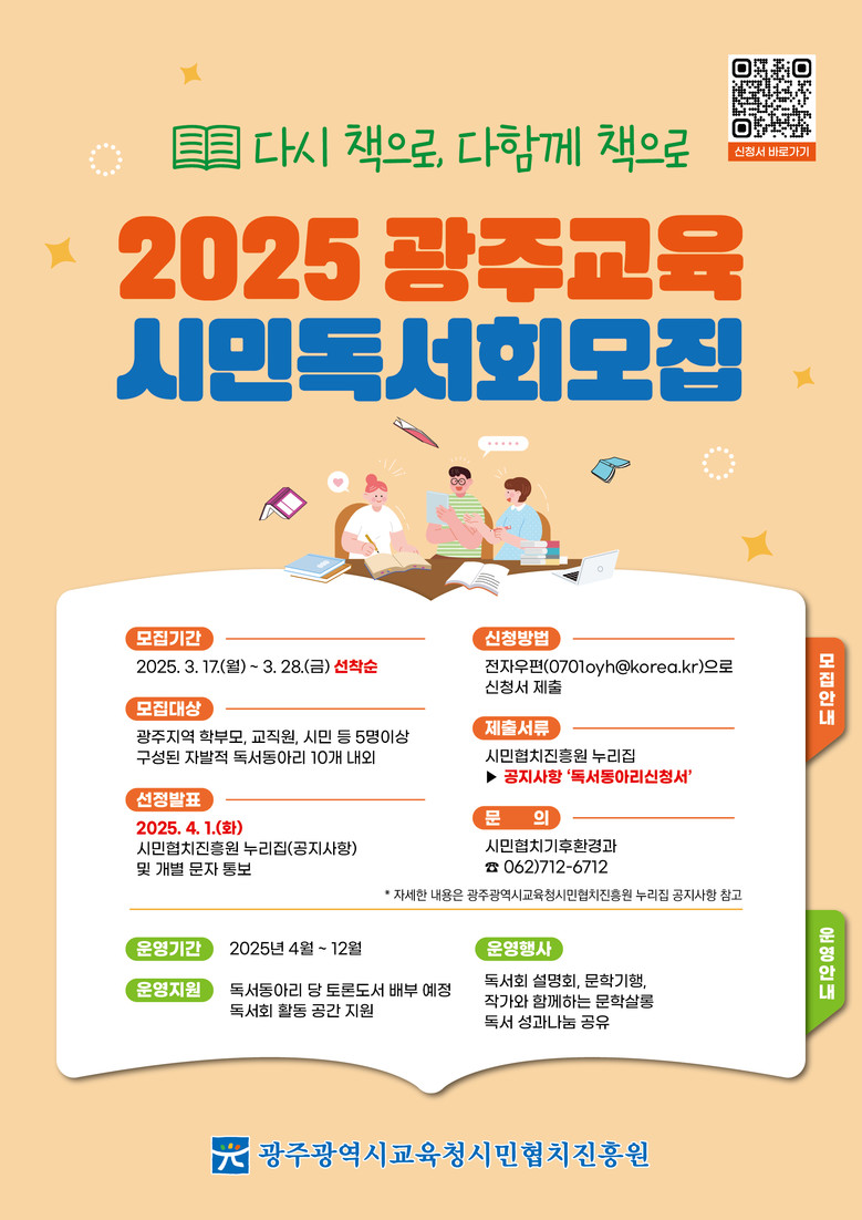 대상은 광주지역 학부모, 교직원, 시민 등이며, 팀당 5명 이상 구성된 자발적 독서 동아리로 참여해야 한다.