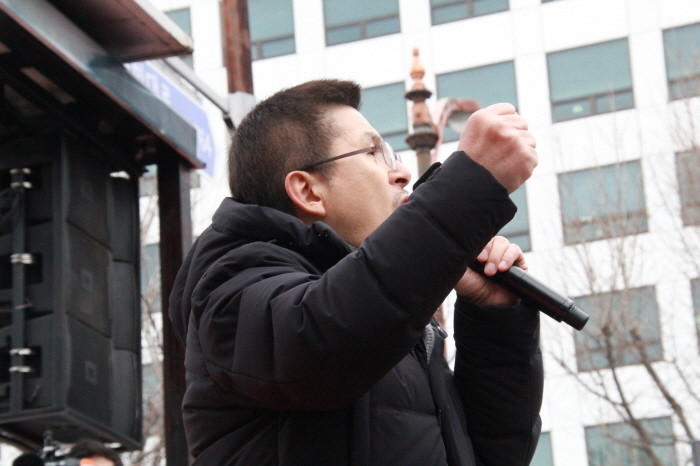 [세계타임즈 이판석 기자] 자유한국당 황교안 대표와 의원들이 17일 오후 서울 영등포구 여의도 국회앞 에서 열린 '공수처법 선거법 날치기 저지 규탄대회'에서 모두발언을 하고 있다.