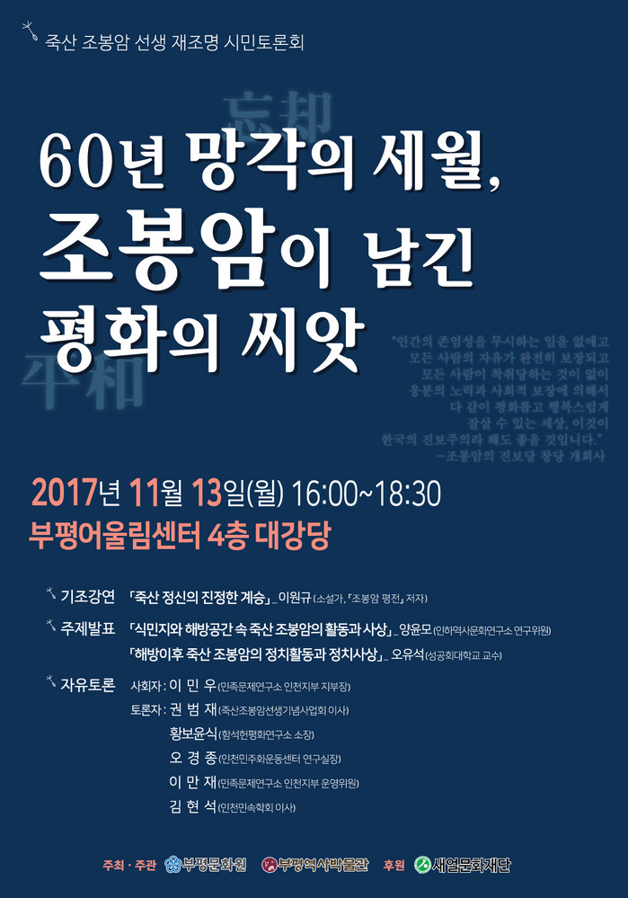 부평문화원, 부평역사박물관이 주관·주최하고 새얼문화재단이 후원하는 토론회 ‘60년 망각의 세월, 조봉암이 남긴 평화의 씨앗’이 오는 13일 오후 4시부터 부평어울림센터 4층 대강당에서 열린다.