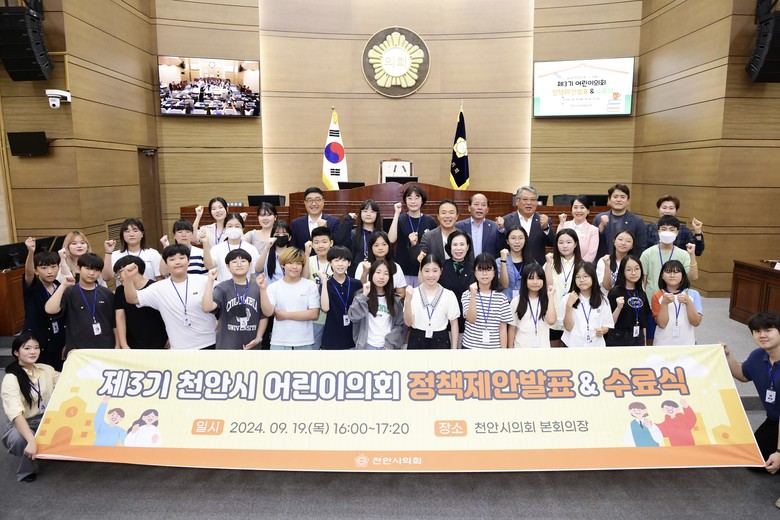 [천안시 세계타임즈=백택기 기자] 제3기 천안시 어린이의회 정책제안 발표회 및 수료식이 대단원의 막을 내렸다. 2024년 9월 19일, 김행금 의장을 비롯한 상임위원장 및 의원들과 26명의 어린이의원들은 학부모와 관계자들을 초청하여 정책제안 발표회와 수료식을 개최했다.