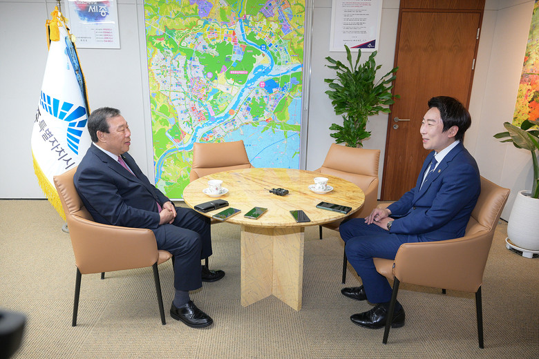 최민호 시장은 19일 시장 집무실에서 임채성 의장을 만나 행정수도 완성에 대한 시민들의 관심이 어느 때보다 높은 상황에서 향후 행정수도 세종 완성 대응 방안 등에 대해 의견을 나눴다.
