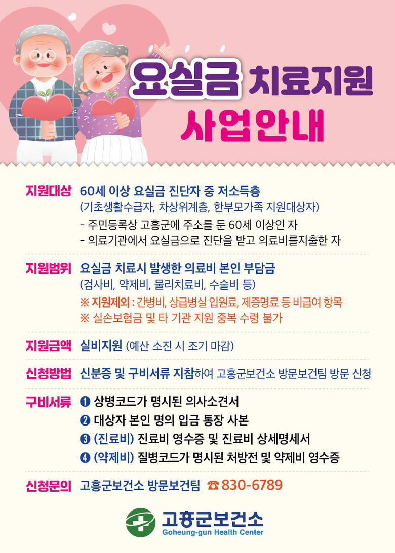 지원 대상은 고흥군에 주소를 둔 60세 이상 어르신 중 의료기관에서 요실금 진단을 받고 치료비를 지출한 ▲기초생활수급자 ▲차상위계층 ▲한부모가족 등 저소득층이다.