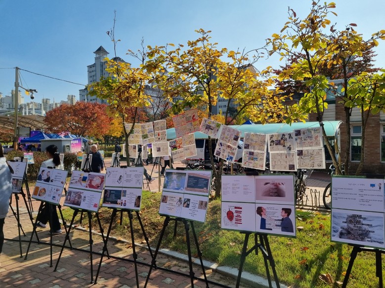 ‘능곡 유니버스 전시 부스’는 학교비전(미래를 여는 교육, 꿈을 키우는 학교)과 학년 가치(같이의 가치) 알리기 활동과 교과 및 자유학기 시간에 활동한 작품을 전시하는 부스로 1학년 도우미 학생들과 본교 교사가 전시작품에 대해 직접 설명하여 마을 주민과 어린이들이 전시작품을 감상하고 체험할 수 있도록 도움을 주었다.