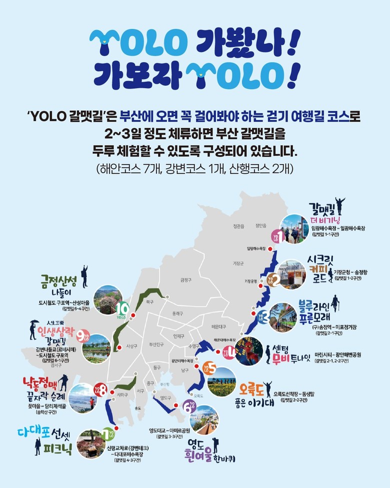 참가자들은 부산의 땅끝, 동해안과 남해안이 만나는 상징적인 장소(스팟)인 오륙도로 이동하여 4.5킬로미터(km)의 ‘욜로(YOLO) 갈맷길’ 5코스(오륙도 품은 이기대)를 완보하고, ‘욜로(YOLO) 갈맷길’ 6코스(영도 흰여울 한바퀴) 일부를 경유해 영도구 아르떼뮤지엄과 피아크를 방문하여 부산의 예술·문화 공간을 체험할 예정이다.