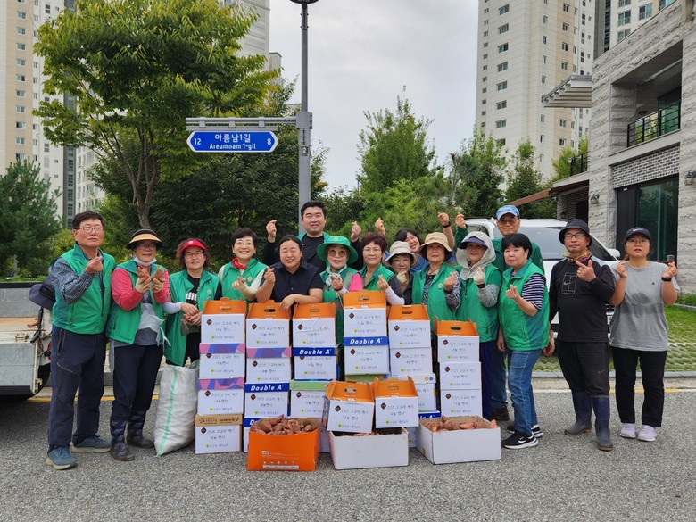 이날 새마을협의회 회원과 도담동장을 비롯한 도담동 직원, 통장협의회장 등 20여 명은 직접 수확한 고구마를 정성껏 포장해 대상 가구와 경로당에 전달했다.