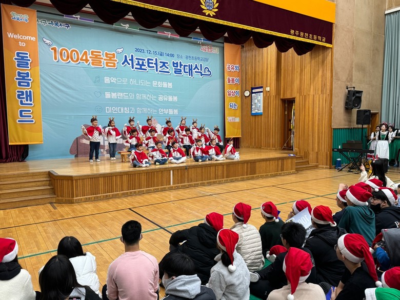 17일 광주광천초병설유치원에 따르면 이번 행사는 ‘다가치 함께하는 돌봄문화 조성’을 기치로 한 ‘1004돌봄 서포터즈단’ 발족을 기념하기 위해 마련됐다. 병설유치원 7세 반 유아들은 김이강 서구청장을 비롯한 300여 명의 참석자 앞에서 ‘Mommy I Love You’ 음악에 맞춰 합창과 수화를 하는 축하공연으로 행사를 더 빛나게 했다.