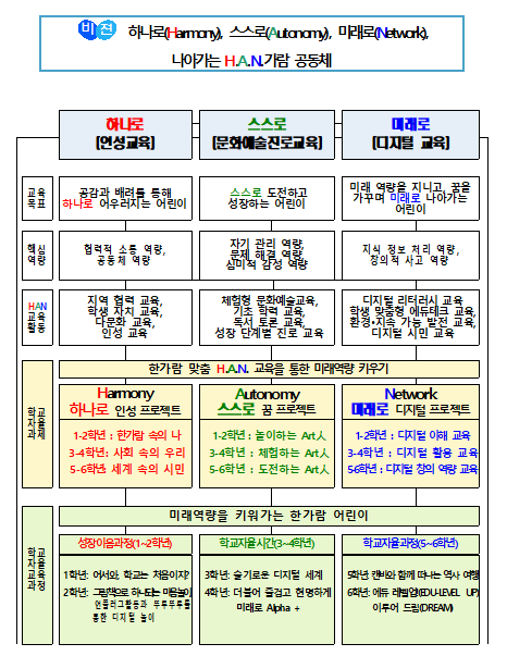 ◦ 교육과정 TF팀 운영 및 교육공동체 의견 수렴하여 “따뜻한 인성으로 하나되어 스스로 미래를 꿈꾸는 어린이”로 교훈 정해