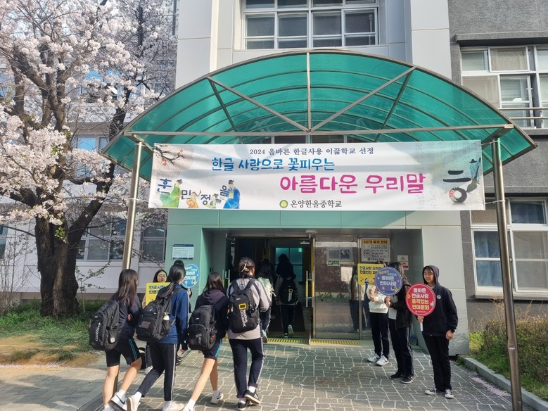 [아산시 세계타임즈=백택기 기자] 온양한올중학교(교장 박성병)은 올해도 ‘2024 올바른 한글사용 이끎학교’로 선정되었다. 올바른 한글 사용 이끎학교는 충청남도 교육청 사업선택제의 일환으로 2021년부터 시작되어 학생, 학부모, 교직원을 대상으로 한글의 올바른 사용과 한글 교육 내실화를 목적으로 추진 중인 사업이다.